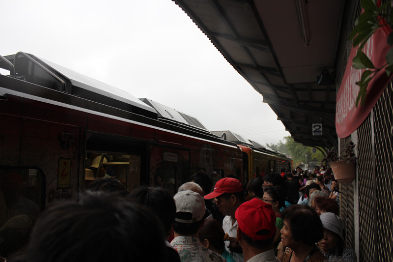 窓口で「瑞芳駅」までの切符を購入し電車に乗る。 電車は満員。 結構な観光地なのに、1時間に1本しか走ってないんだもんね。