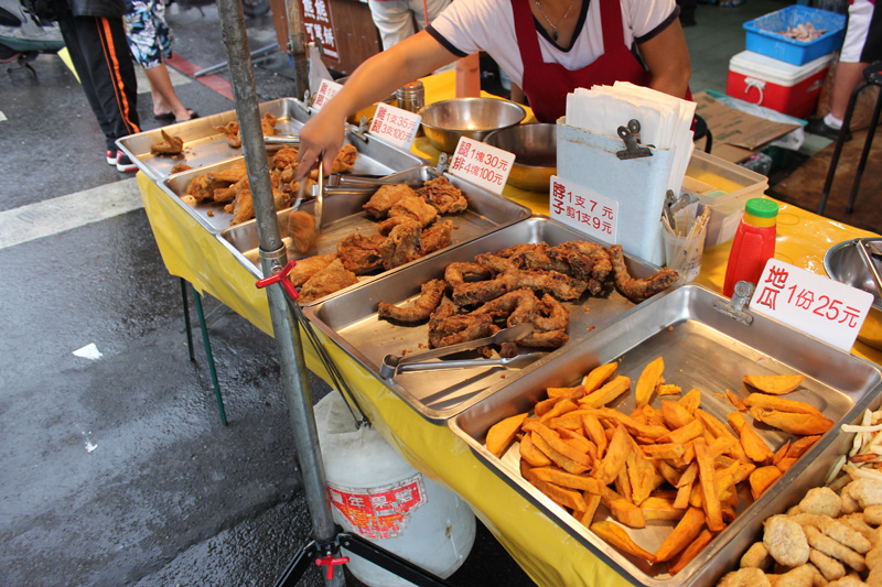駅前の通りを歩いてみると、揚げ物を打っている屋台を発見。 台湾っぽい揚げ物ではなく、フライドチキンとか唐揚げみたいなやつとかで、かなりおいしそう!