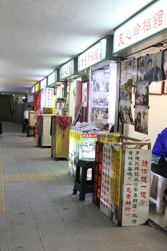 行天宮の目の前の交差点には地下道がある。 この地下道に「占い横丁」といい、占い屋が軒を連ねている場所がある。 「日本語OK」も店も何軒かある。