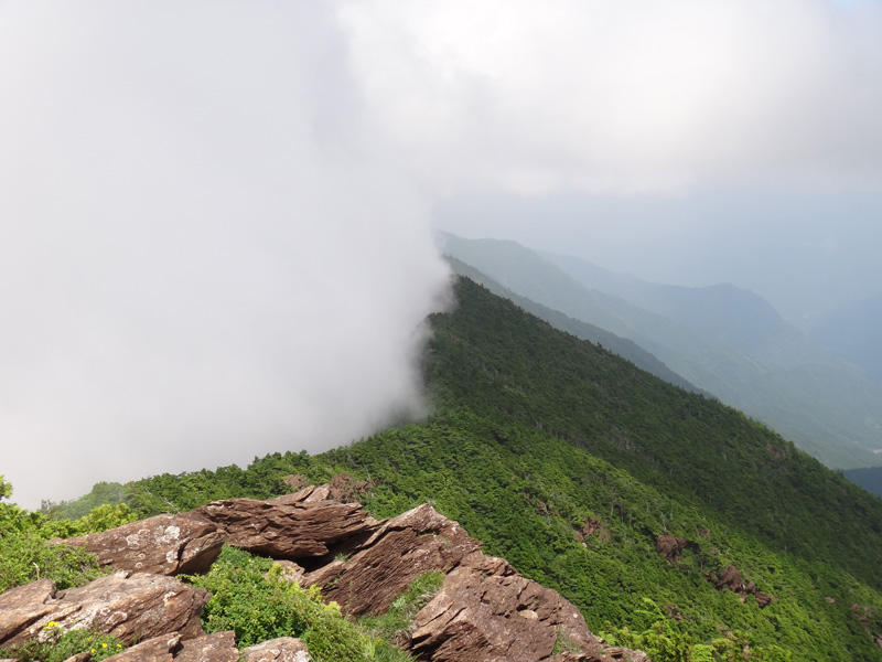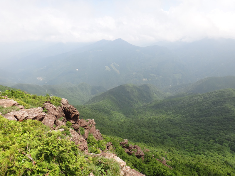 そして目の前が開ける。 前には雄大な岩山が広がっている。 みんなにこの景色を見せたかった。 四国の山って笹が覆い茂っている丸い山が多いのだけど、この山は全く四国の山に見えない。 山頂にこんな岩稜が広がっているとは。