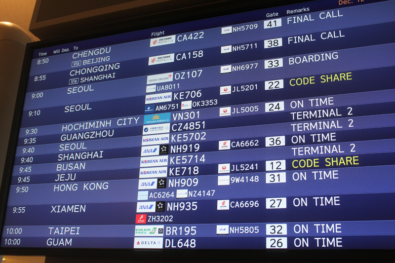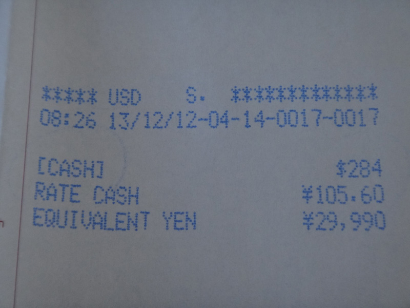 荷物を預けて、出国の準備は整った。 ここで一旦解散になり、搭乗開始の10分前、9時20分に、搭乗ゲートの前に再集合する事になった。 ドルはグアムで両替するより、国内で両替した方がレートがいいそうなので、空港の両替カウンターで両替していく。 とりあえずUFJ銀行の窓口で、3万円を両替。 レートは思っていたより悪く、1ドル105.60円だった。 3万円が284ドルにしかならなかった……