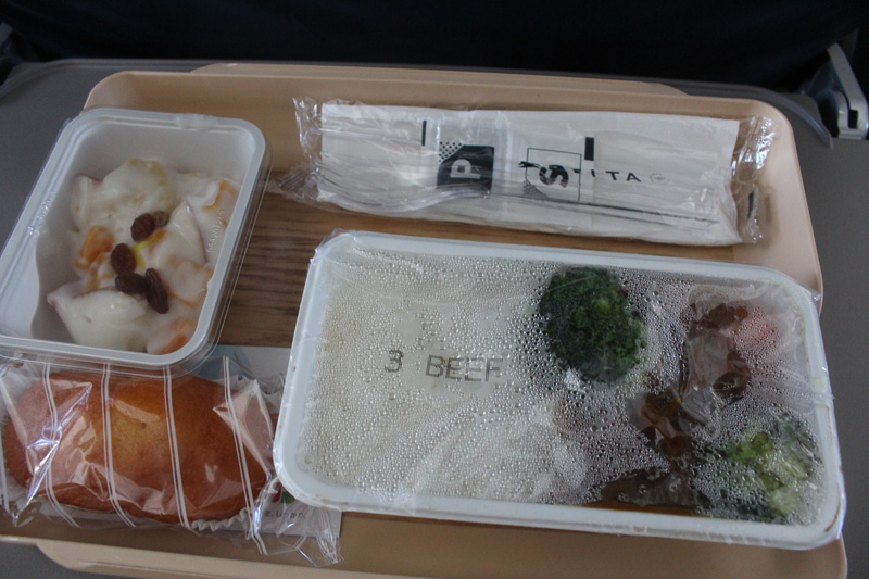 てしまっていた。 しばらくして機内食が運ばれてくる ビーフかチキンを選ぶ余地すらなく、強制的にカレーが出された。 カレーにヨーグルトみたいなデザートと小さなお菓子が付いている。 カレーはご飯がかなり固かった…… あまり美味しくなかったな……