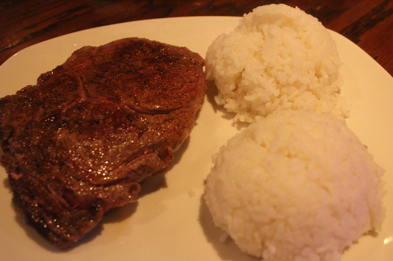 そろそろ夕飯の時間。 グアム一発目の夕飯は、ホテル目の前のステーキ屋「Outback」という店に入った。 ウェイターのフェイバリットなステーキはこれだよ、と教えてくれたのでそれを注文。 スープかサラダ、ご飯かパンか選べて、サラダとパンにした。
