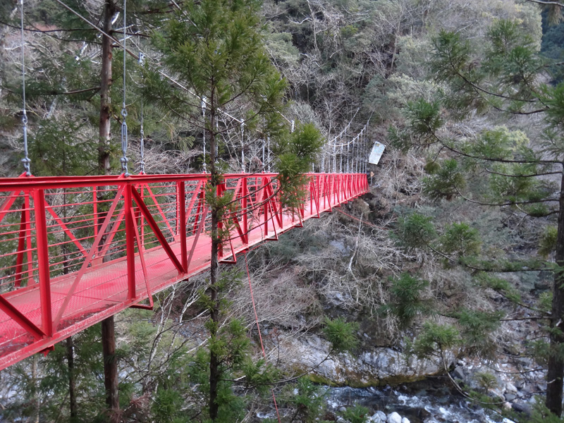 駐車場に車を止めるが、当然誰もいない。 登山の準備をして出発。 赤い橋を渡って登山道へ。 出だしはめちゃめちゃきついじゃないか…… 数分登ると、周遊ルートとの分岐があり、山頂方面に向かって歩いていく。 途中でロープの張られている区間があり、足を滑らせないように張ってあるのかな、前は無かったような気がする。 しばらく歩くと、竜頭谷に到着。 川渡った反対側で少し休憩。 お茶を飲んだりおにぎり食べたりしていたのだけど、対岸(登山口側)から、ゴロゴロと岩が落ちてくる。 頭より少し小さい程度の岩場すごい勢いで斜面を転がっていた。 さすが危険な山だ……
