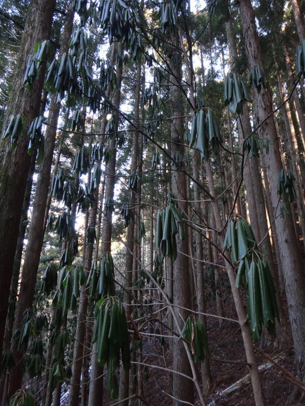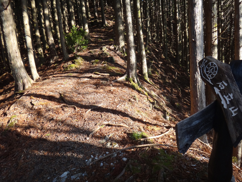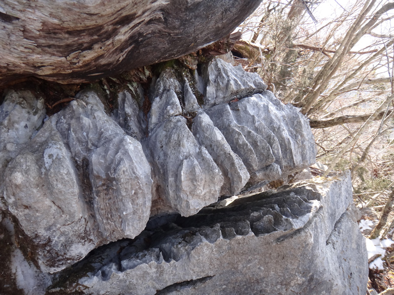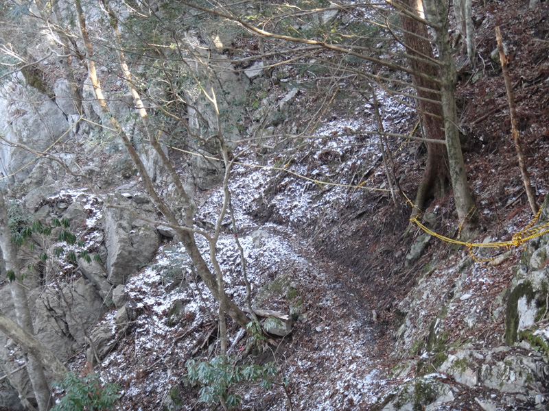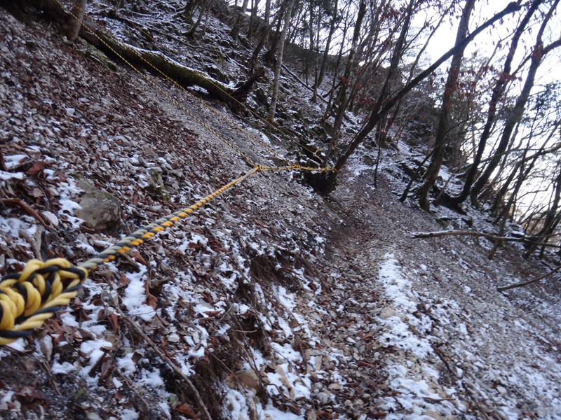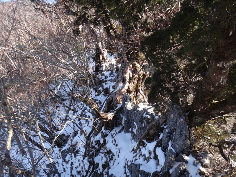 さて、ここから下山するのだが、下山が怖いなぁ…… 登りなので、滑りにも耐えられたけど、下りはさらに滑るだろう。 気を付けなくては…… 捨身ヶ嶽まで戻って、そこから一気に下っていく。 やはり足元は滑りまくり。 ストックを活用して、ゆっくりと下りていく。 危険な岩場を越えて、ひと段落。