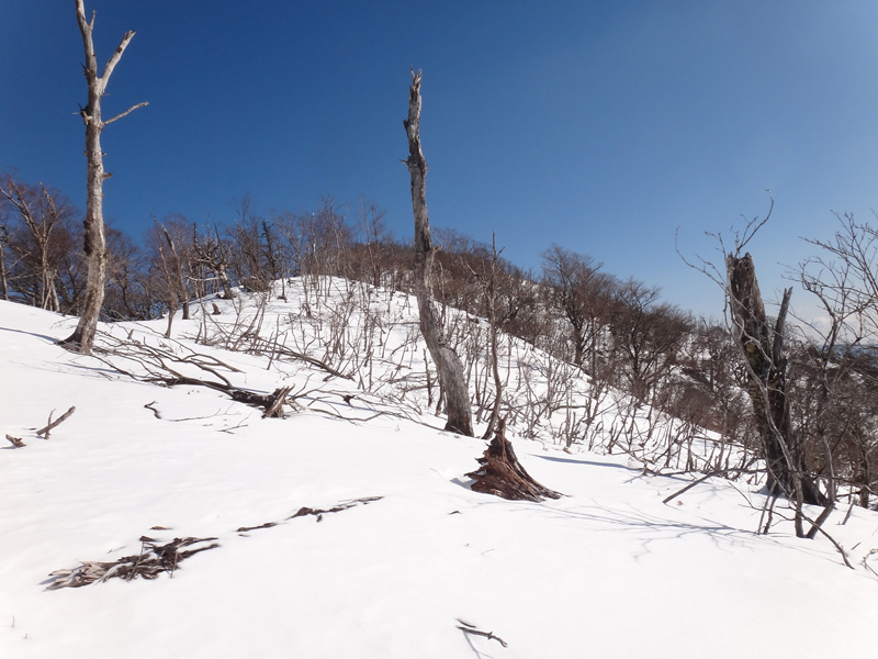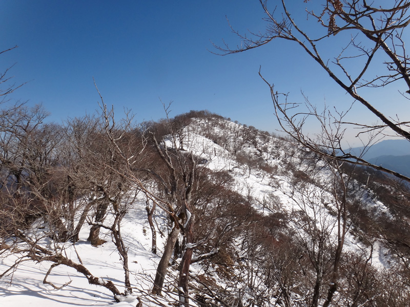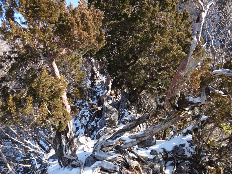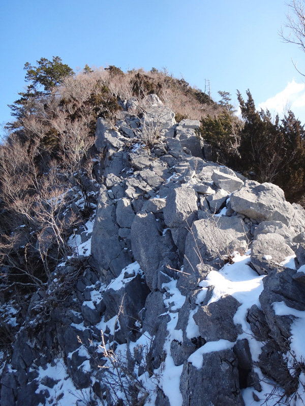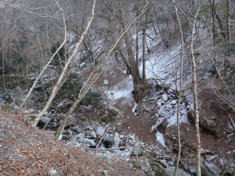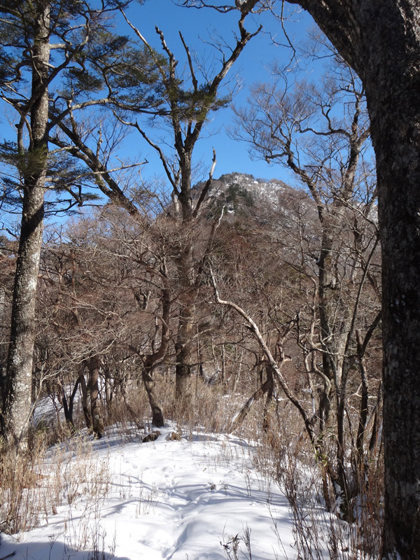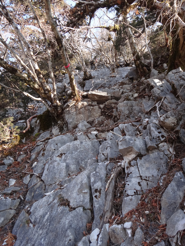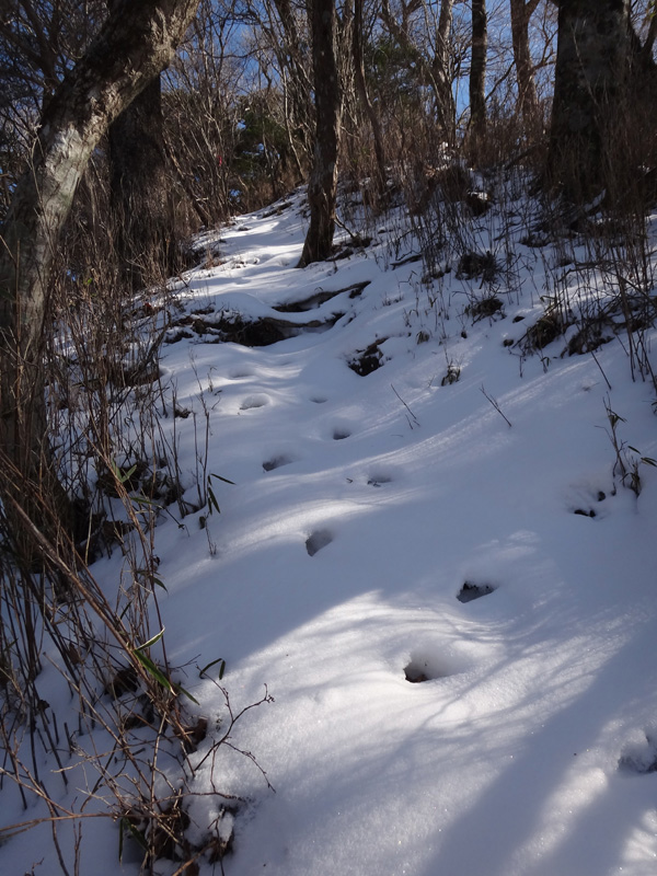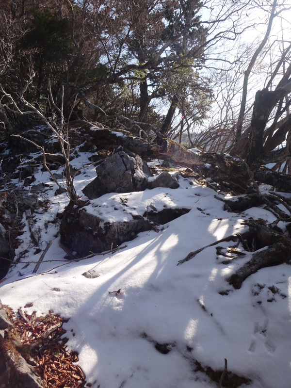 ここから先の道を全然覚えていないのだけど、地図を見ると一直線に登っていき、結構急なように見える。 この辺りから、雪が常に出現しているような感じ。 ただ、数センチしか積もっていない。 全体的に岩の多い道で、数センチの積雪だと、逆にメチャメチャ滑る。 たまにくるぶしが埋まるくらいまで積もっていることがあるが、これくらい積もってくれないと、足が取られてしまうな……