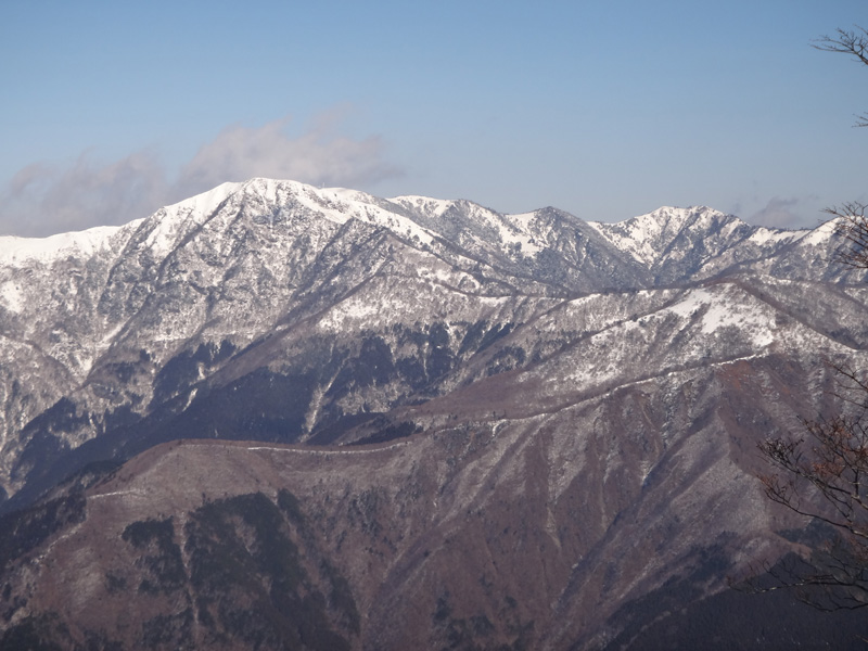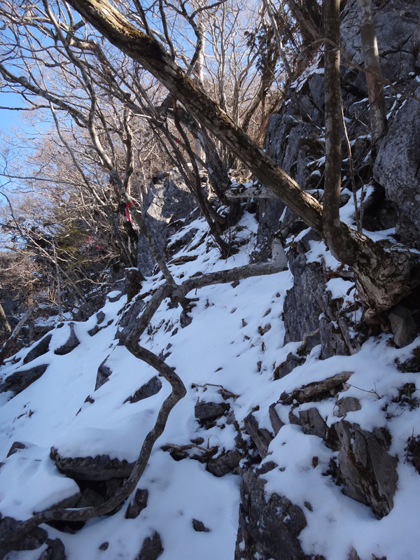 この地帯を抜けると、いよいよ石立山の真骨頂に突入していく。 傾斜が一気にきつくなり、岩がむき出しになっている。 これらの岩をつかみながら登っていく。 とても足だけじゃ登れないような道。 この辺りでピッケル使う予定で来たのだけど、雪は全く無く…… 手足を使ってどんどんと登っていく。 しばらく登って、いったん樹林帯の中に入る。 さらに登ると、見晴らしのいい岩場に出た。 ここから景色が綺麗に見えるなぁ。