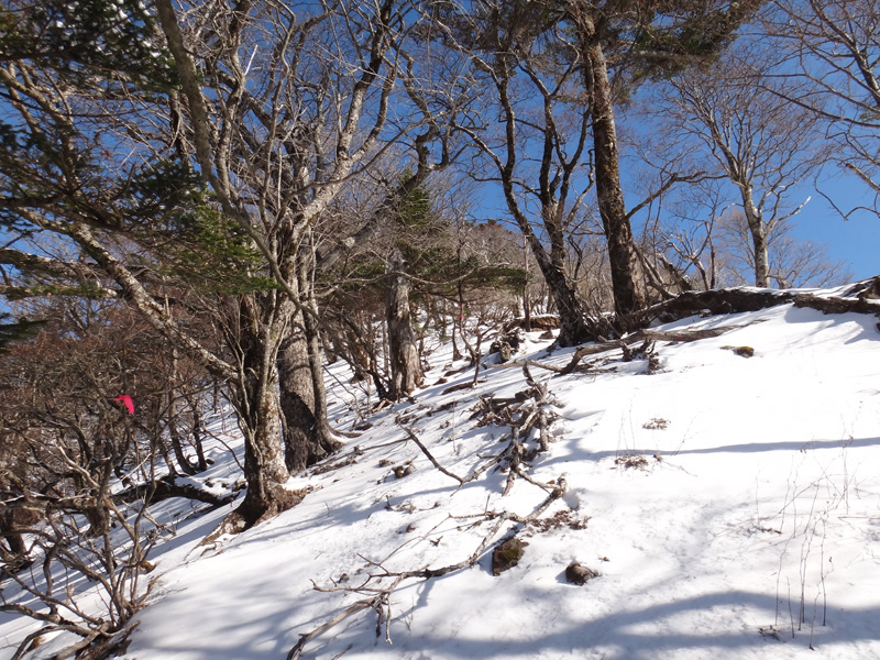 ここからは滑る足元に苦労しながら登っていく。 アイゼンつけるのもなぁ…… あいにく今日は12本爪のアイゼンしか持ってきていない…… こういう時に6本の系アイゼンがあると、気軽につけられるのになぁ……
