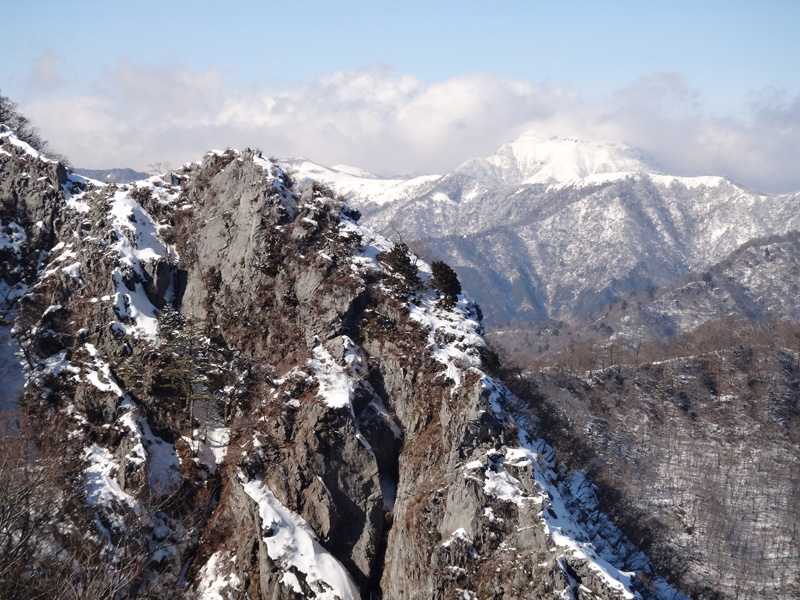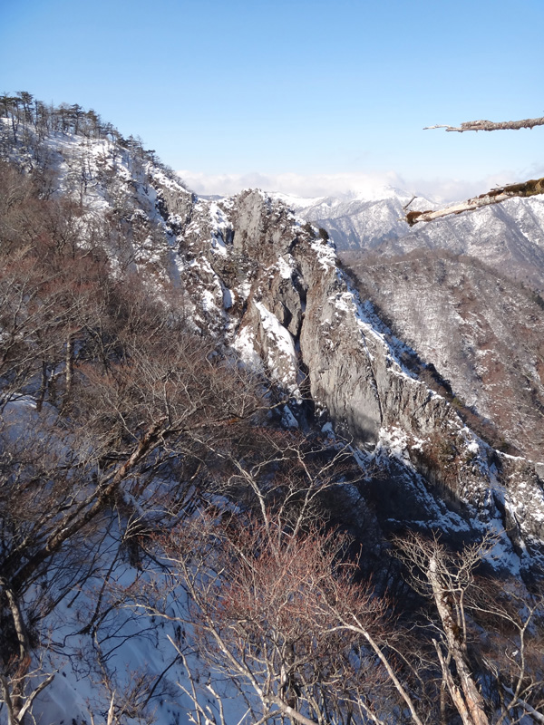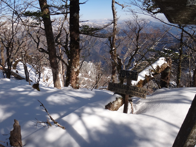 苦労しながら上がっていく。 そして、捨身ヶ嶽まで到着。 ここから素晴らしい崖の景色が見える。 この辺りになると、積雪も多いな。 さて、ここから石立山山頂まで、もうひと歩き。 この辺りで、すねくらいまで埋まる積雪だった。 角度を変えて捨身ヶ嶽を眺める。 すごい崖だなぁ。 石灰岩がむき出しになっているのだろうか。 まさしく岩山って感じがする。 綺麗な景色を見ながら歩き、山頂に到着。