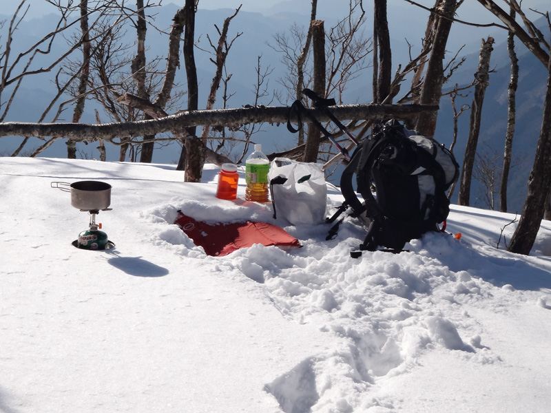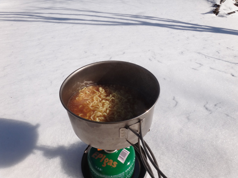 ここは少し風があるので、ちょっと戻ったところで休憩することに。 ラーメンを食べて体を温める。