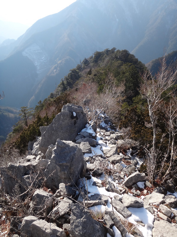 そこからもほとんど雪が無い状態で登っていく。 地図上で「危険な岩場」という地帯を通り過ぎて少し登ったところで休憩。