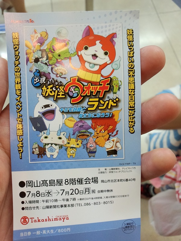 バスは岡山駅に到着。 さて、好日山荘にでも行くか。 道がわからないので地下街に入って、高島屋直結の通路で高島屋のB1へ。 すると「妖怪ウォッチ展」みたいなものが開催されていて、今日が最終日だった。