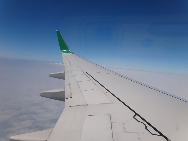 荷物を預けるのと、搭乗手続きで少し手間取ってしまった。 預ける荷物をX線検査するのだけど、ガスストーブがひっかかり、ガス残量が残っていないかチェックさせてください、と。 ザックの一番下に眠っているので、荷物を全部掘り起こして大変だった……