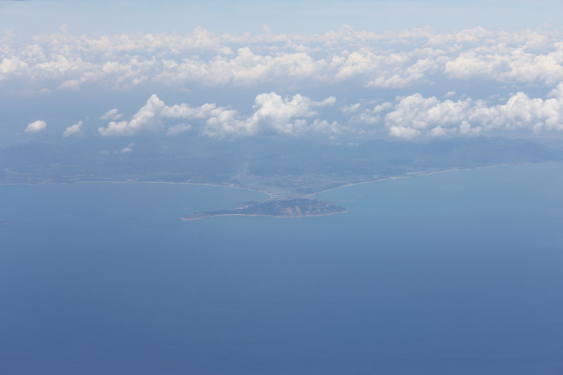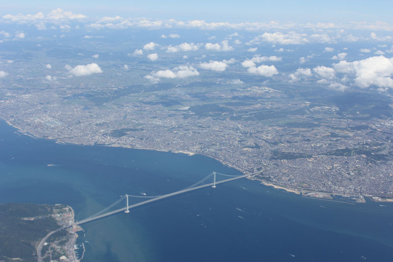飛行機は窓際の席だったので、写真がたくさん撮れるな。 離陸してすぐに明石海峡大橋が見えた。 そして四国・九州上空を通過し、東シナ海へと飛んで行く。