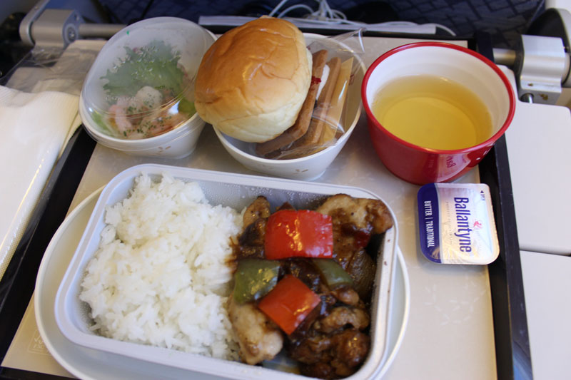 途中で機内サービスがあり、機内食が提供された。 ビーフorチキンで、ビーフの方はカレーのなんとか、と言っていたので、チキンを選択。 ご飯はタイ米っぽくてパサパサしてるし、鶏肉もいわゆる海外のクセのあるような味だった。