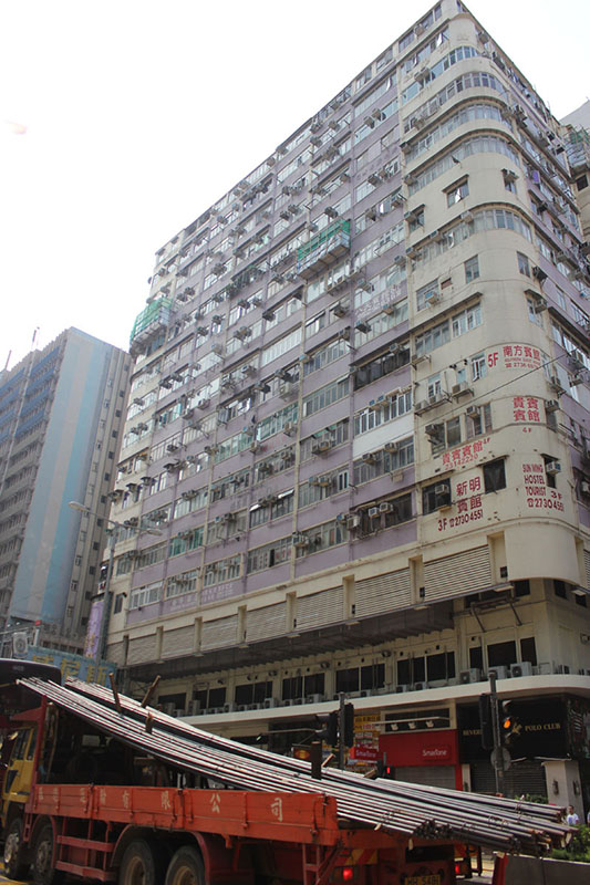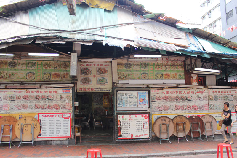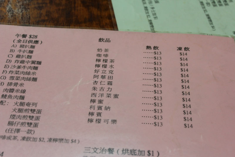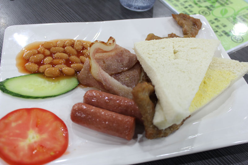 とりあえず、九龍駅から外に出て、「Nathan Road」を目指す。 いわゆる香港の中心部で、道路に飛び出す看板が多数見られる地域なので、ここは行っておかなくてはならない。 東へ向かって歩いて行く。 途中で怪しいビルとかいろいろあって楽しみながら歩いて行く。 歩いている途中に、庶民的な食堂があったので、ここで朝ご飯を食べることに。 メニューが漢字のみで全然わからないが「西冷牛☆」(☆は手へんに八)という料理がメインで、サイドメニューが2つ選べるのだが「腸仔」「燻鴨胸」というのを選んだ。 そしたらサンドイッチみたいなものが出てきた。 腸仔は、どうやらウィンナーっぽい。 味は普通だった、これで32HK$、日本円で560円くらい、まぁ値段的にも普通か。