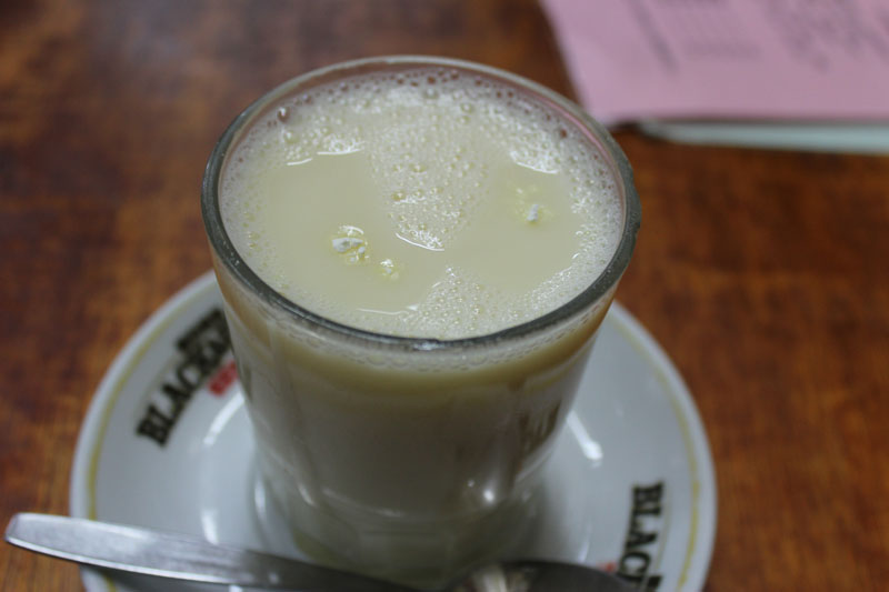 そのまましばらく歩くと、地元の人しか来なそうな怪しいお店を発見。 さきほど朝ご飯を食べてから1時間も経ってないと思うが、飲み物だけでもいいので、これは入らなくては。 怪しいお店に入って「杏仁霜」というドリンクのホットを注文。 台湾でも杏仁のドリンクがあったので、味はだいたい想像がつく。 ドリンクを飲んで休憩して、また散策する。