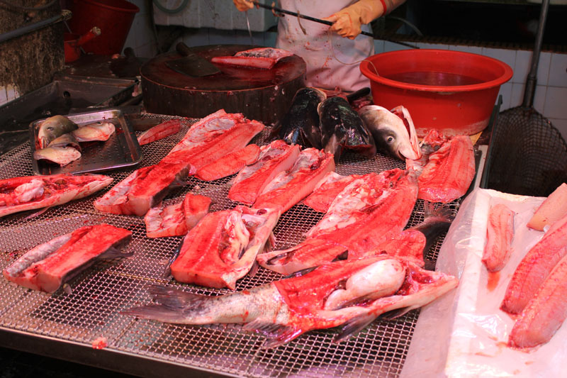 さらに歩き、怪しい屋台村を発見。 さっそく屋台村を見学する。 目の前で肉の塊をさばいていたり、毛皮の付いたままの動物の足が放置されていたりと、かなり衝撃的な屋台村だった。 屋台村の北側には宝石市場みたいなのがあり、入ったらひたすら翡翠の宣伝をされた。