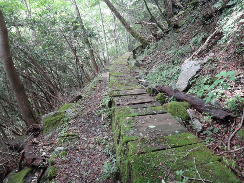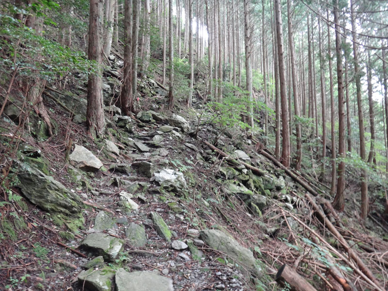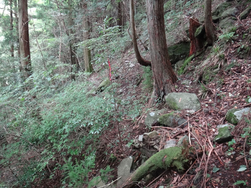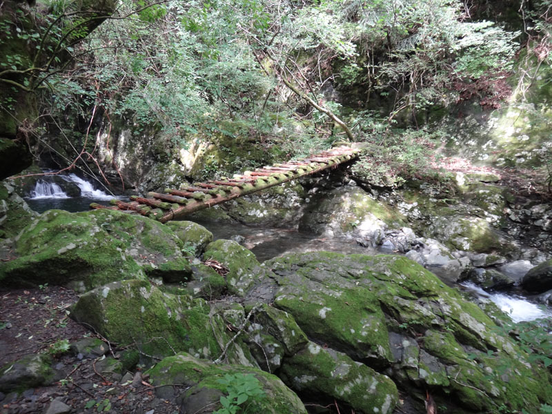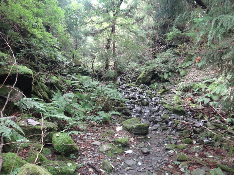 なかなか思うように進めず、だいぶ時間がかかってしまう。 とうとう、川沿いは岩壁が続く地帯で歩けなくなってしまったので、山の中へ。 一気に上に上がったら、あら道があった!?