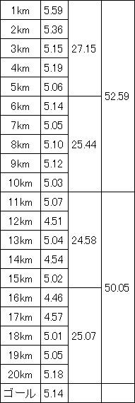 前半10kmまでは、去年より32秒速いペースだった。 10~15kmで23秒遅く、15~20kmで1分9秒遅く……