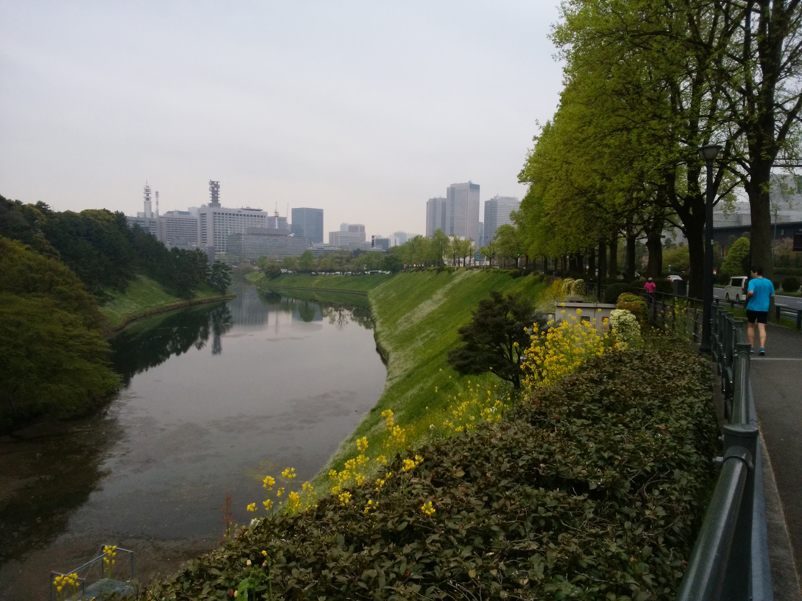 半蔵門から反時計回りに皇居を一周する。 最初は下り坂、坂を降りて行ったら「桜田門」というところにでた。 小学校の歴史で習った「桜田門の変」の場所らしい。 写真とか撮りたかったが走っているし取れなかった。 右側の方には国会議事堂や国立劇場や警視庁があった。 皇居の周りって、日本の中心なのだね。