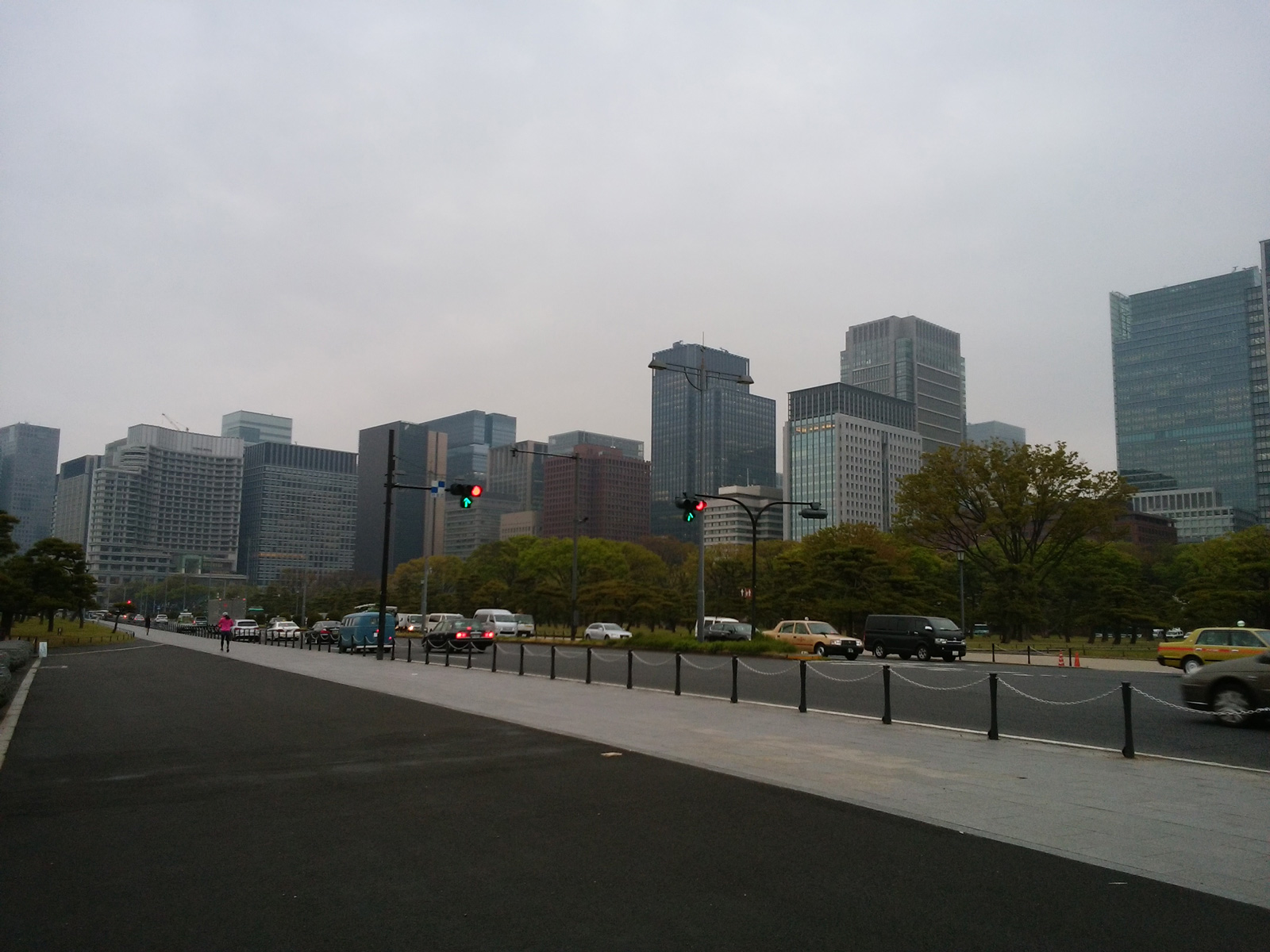 そして、内堀通りとう、皇居の正面の大きな通りを走っていく。 右手には丸の内が見える、オフィス街の中心。 東京駅の方も見えた。