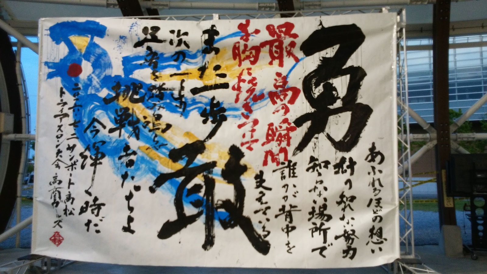 それからサンポートへ。 トライアスロンの受付をして、16時半からの説明会に参加、18時からの前夜祭に出る。 今回のトライアスロンでは堀江貴文と安田団長が出場することがわかっている。 前夜祭会場にいないか探したら、ホリエモンは見つけた。 が、書道パフォーマンスが終わったらすぐに帰ってしまった。
