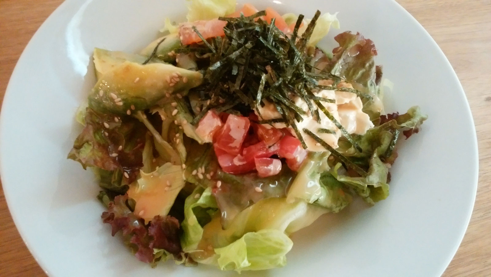 お昼も会社付近でお店を探す。 お昼は選択肢が軽く100店舗近くあるので、どこにするかが逆に悩む。 適当に歩いて「cafe WALL」というお店にすることに。 男1人で入るにはちょっとおしゃれすぎたが、お店がそんなに混んでいなかったので助かった。 「アボカドとサーモンのチリマヨ丼」を食べたけどけっこう量が少なかった。 オシャレ女子向けの量になっているのかもしれない。 それとは別で頼んだカボチャの冷製スープも美味しかった。