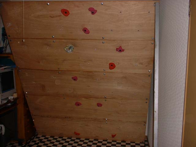 クライミングボード 投稿日時: 2004/04/08 木曜日 投稿者: U 仕事帰りに津田沼の登山用品店に寄っていった。 クライミングボードに取り付けるホールドやネジなどを購入。 その後ホームセンターに行き、ボルト、ワッシャなどを買った。 家に帰ってクライミングボードの組み立ての続きをする。 重い作業を1人でやるのはつらい。 3時間くらいでようやく完成した。 ホールドを取り付けたらこんなになった。 これで自宅トレーニングできる! ってもっとホールド増やさなければ…