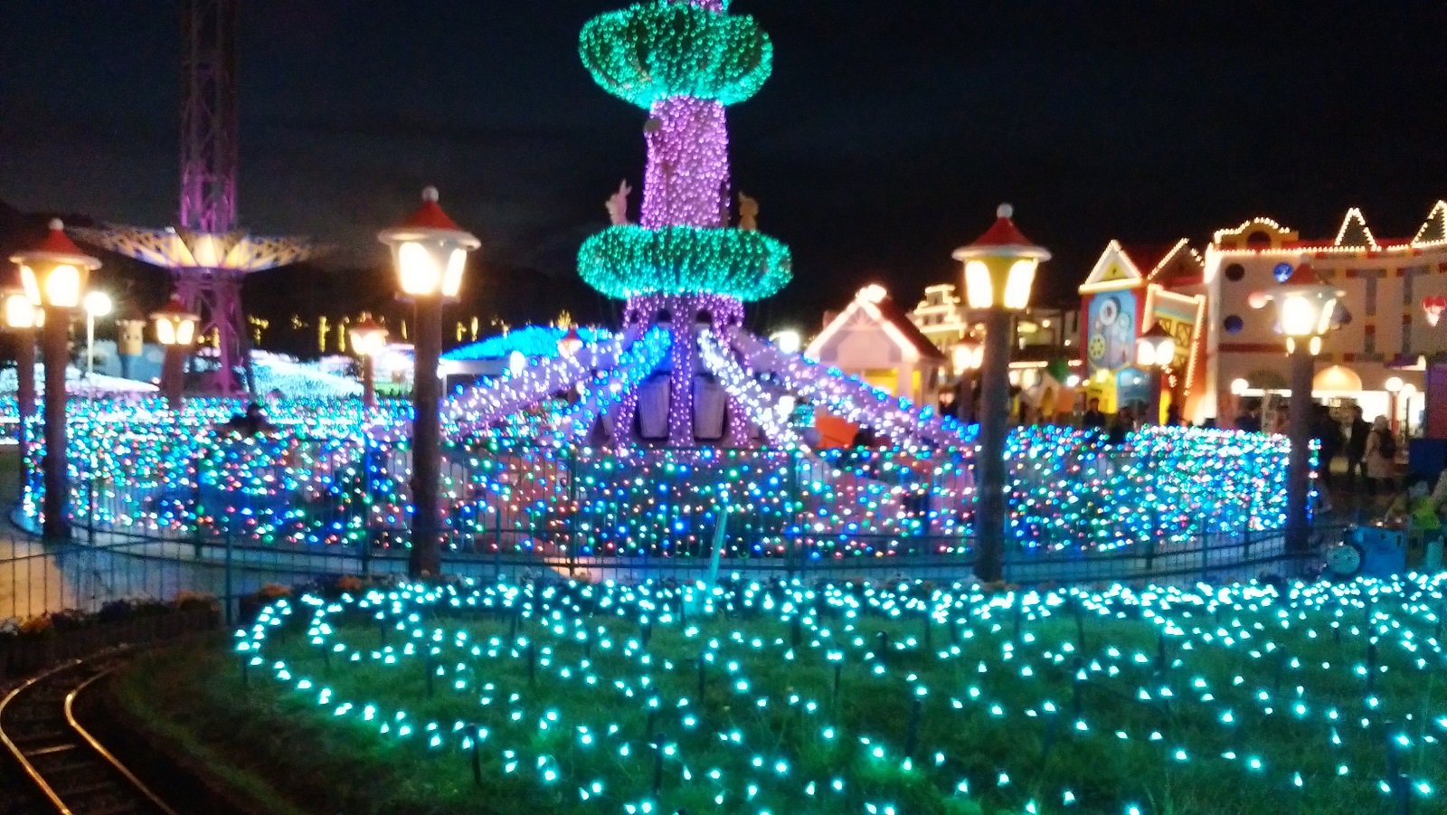 かなり冷えてきたので最後にもう一度「レッツゴートーマス」「ファンシーフライト」に乗って、レオマワールドから帰ることに。 とりあえず二人共フリーパスの元は取れたっぽい。 入園料以外に3,000円くらい使ってしまった……