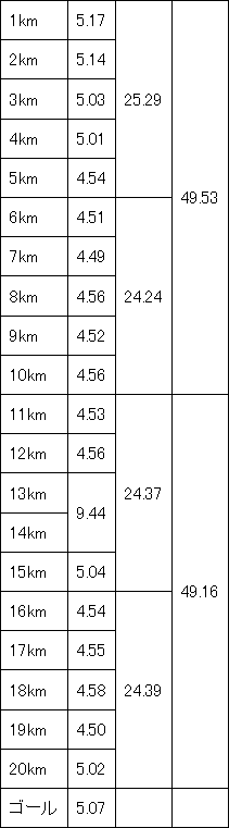 もうここからは必死だった。 18km過ぎの給水も取りたかったがペースを落とすことになるので取らず。 前に50歳代後半くらいの太めなおじさんが走っていて、オレよりちょっと速いくらいのペースだった。 なんとかそのおじさんに付いていこうと、ずっと真後ろについて走る。 このおじさんに引っ張ってもらう形で19kmを4分50秒。 ラスト2km。 が、20kmが5分2秒と5分を超えてしまう…… ラスト1km、いつもやっているラストスパートのトレーニングを思い出して必死に走る。 だが、本当にラストスパートするにはまだ早すぎる。 20km走って1kmをラストスパートできるほど鍛え上げられていない、せいぜいラスト500mだ……