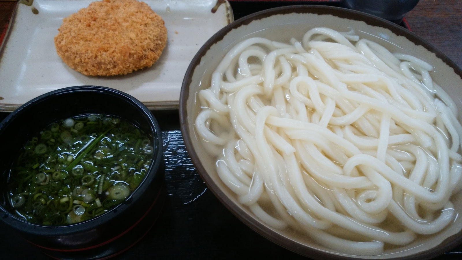 お昼は「ぼっこ屋」へ。 今日は肌寒かったので、湯だめうどんとメンチカツにした。