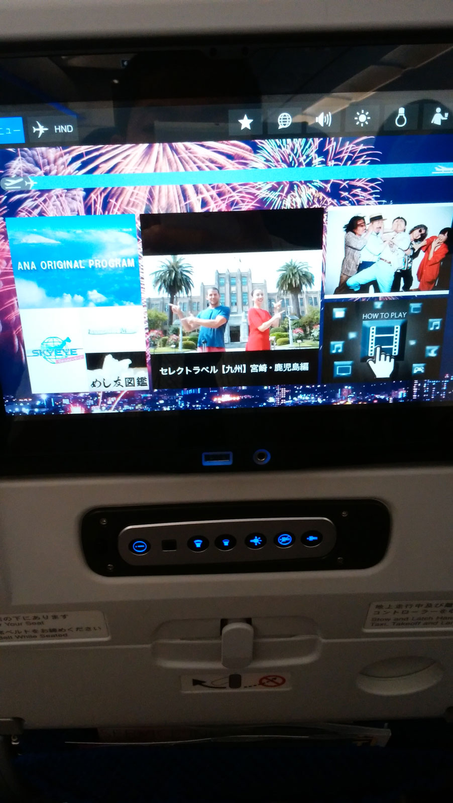 下り2.4Mbps、上り0.1Mbpsしか出なかった。 動画やWebサイト見るのはストレスを感じるがSNSくらいならいけるし、そもそも機内でスマホ通信ができるのが素晴らしすぎた。 液晶モニタにはUSBポートもついていて、そこからスマホ充電もできた。