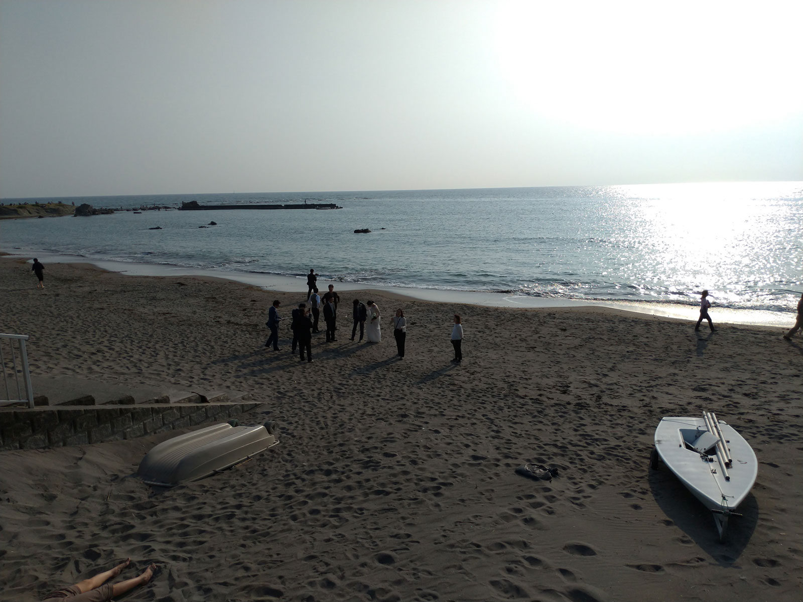 すぐ目の前には海岸があり、そこで新郎新婦と写真撮影などをしたり。 午前中に親族での披露宴は済ませたみたいなので、今この場にいるのは職場の同僚や友達など、気心のしれたメンバーだけらしい。