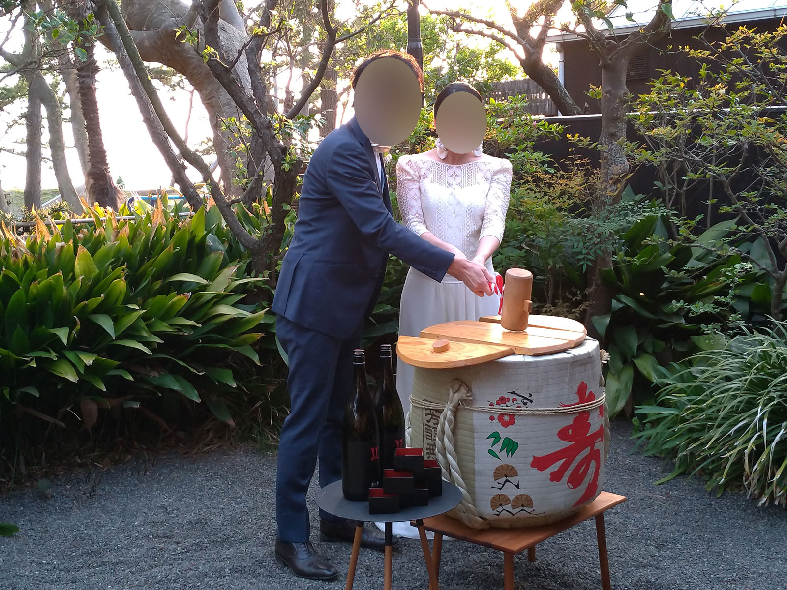 型にとらわれない結婚式をしたかったらしく、日本酒の鏡開きをやったり、日本酒を一升瓶で回し飲みして、最後に主賓が一気に飲み干すとか、若者が馬鹿騒ぎする時のようなノリがあった。 皆大人なので、流石に潰れたり吐いたりするまで飲んだ人はいなかったが。