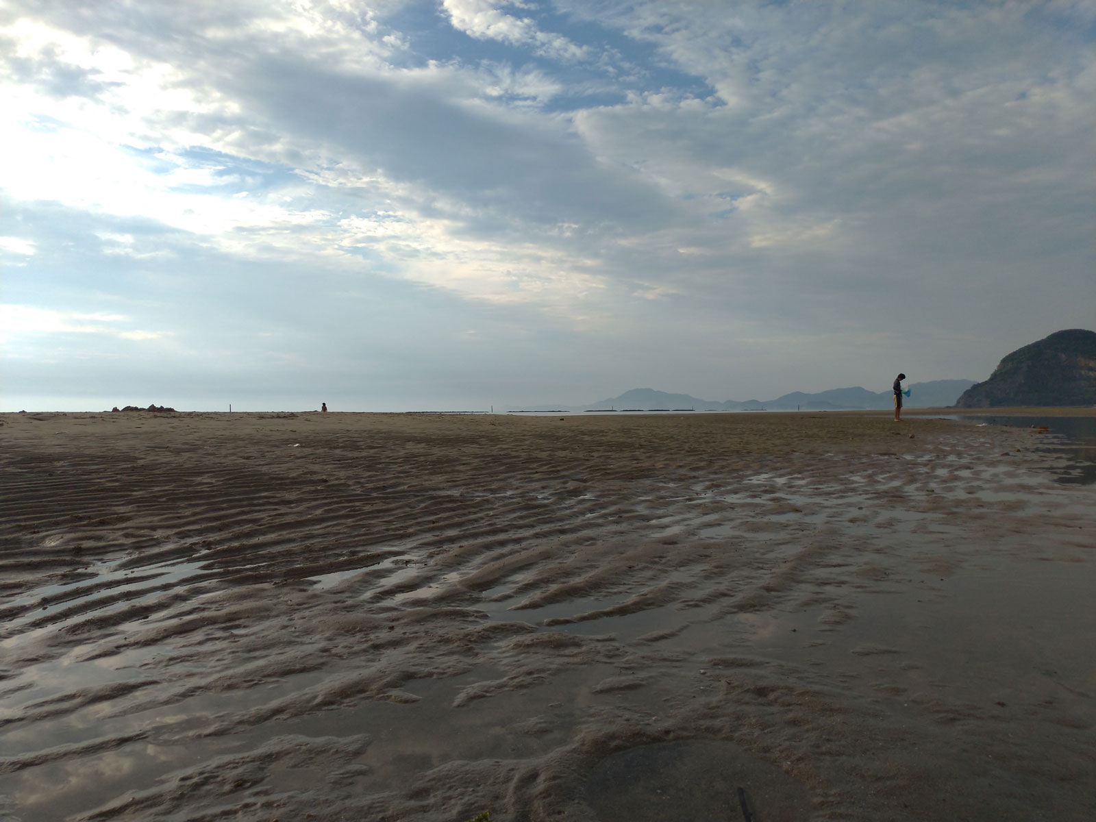 昼食後も海で遊んだり、砂浜で遊んだり。 満潮時刻を過ぎてからは、目に見えて潮がひいていくのがわかる。 そして15時過ぎになって、ようやく浅瀬が出現した。 昨日購入した熱帯魚用の網や水槽を持ってきてあるので、小魚を捕まえたり、ヤドカリを捕まえたりして遊ぶ。 浅瀬の砂はとてもやわらかいので、子供たちはそこにお風呂みたいなものを作って遊んだり、干潮の海を満喫していた。