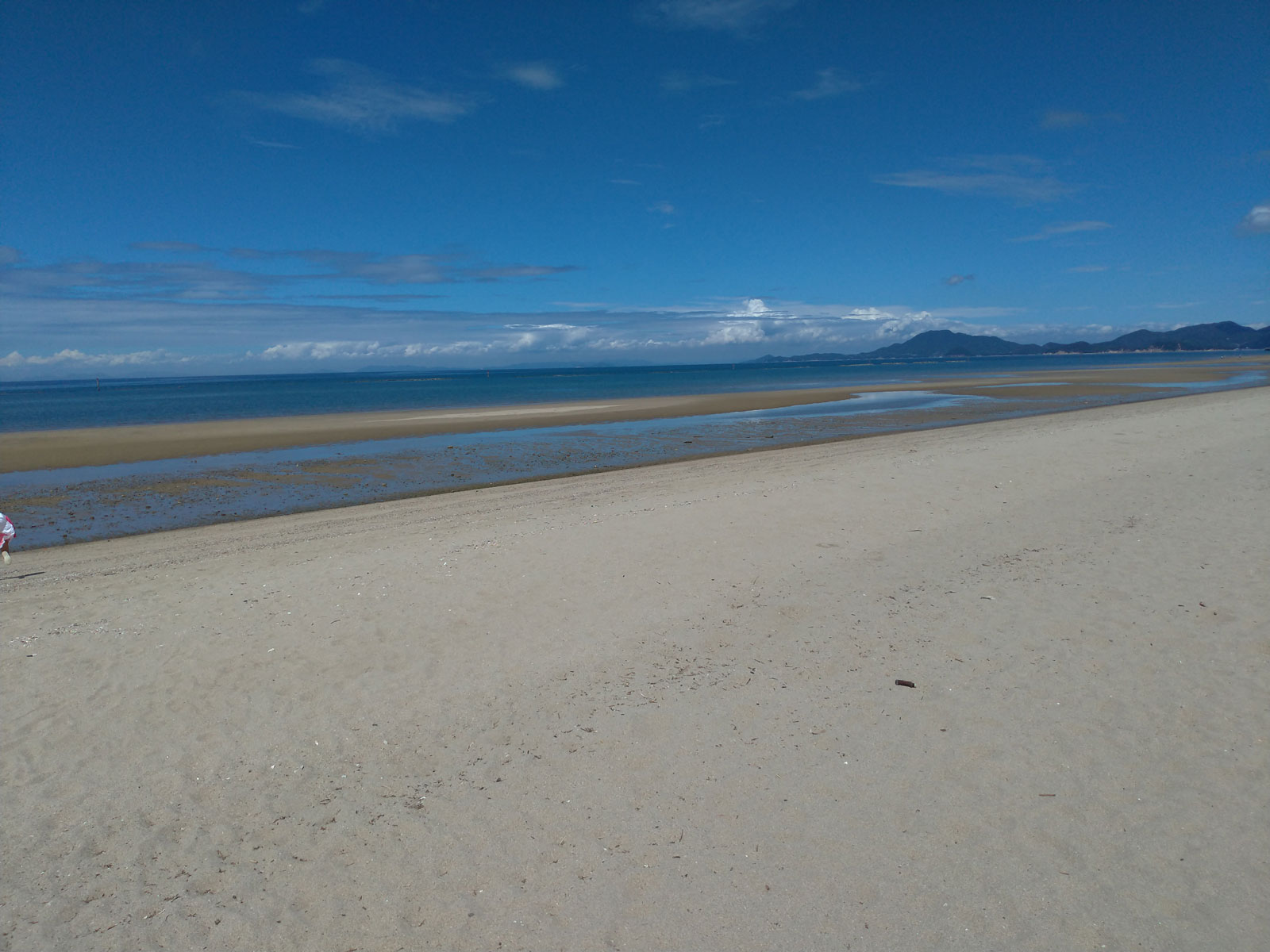 時間をチェックしてきてあるので、ちょうど潮が引いていて、遠浅の海を満喫できそう。 直射日光下はすごい暑さなので、日焼け止めを塗って、砂浜で遊ぶ前に、まずは海に入って全身を濡らす。 濡れた水着を着ているのと、渇いた水着を着ているのでは、暑さが全然違うだろう。