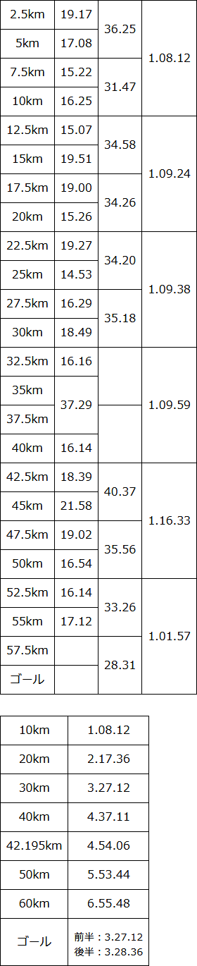 ペース的には、大体10km1時間09分くらい。 40-45kmだけ極端にタイムが落ちてしまったが、だいたい平均的なタイムで走れたのではないだろうか。 10km区切りで見ると、50-60kmのラスト10kmが一番ペースが速く、ラスト5kmはキロ5分40秒まで上げることができた。 前半30kmと後半30kmのタイム差は1分24秒。 疲れの溜まった後半でも粘りの走りができていたことがわかる。