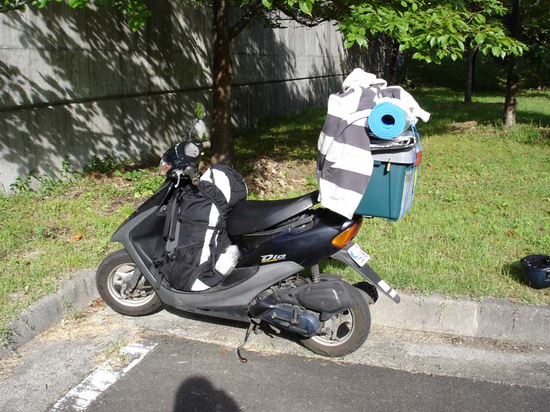 4号線をそれて、県道の坂の途中で道を確認するため立ち止まる。 お腹がすいてきたのでお昼にすることにした。 ゆうべ作ったおにぎり。 しかしものすごくしょっぱかった…… 塩を3分の1くらいに減らさなくては…… おにぎりを食べていたら地元のおじいさんがYaMaHaのJOGに乗ってやってきた。