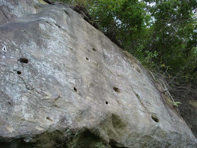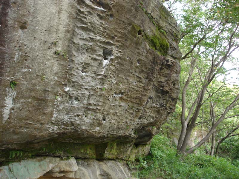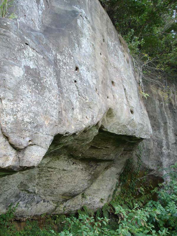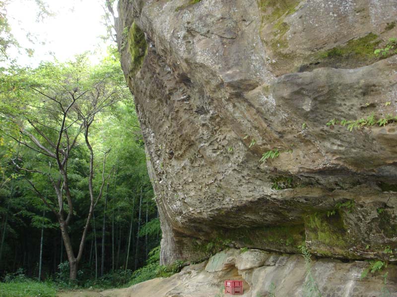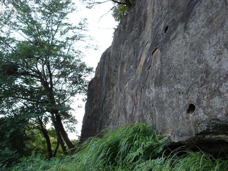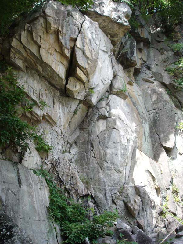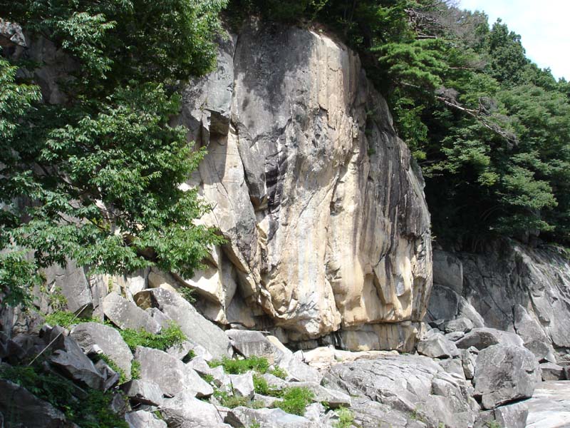 そして迷うことなく大日岩にたどり着く。 駐車場から岩場までは下り坂だった。 岩は川沿いにあるから。 歩いて4分くらいで到着した。 けっこう大きいけれど全体的にボルトや終了点が古い感じがする…… それと直射日光なので夏は暑すぎて登れないっぽい。