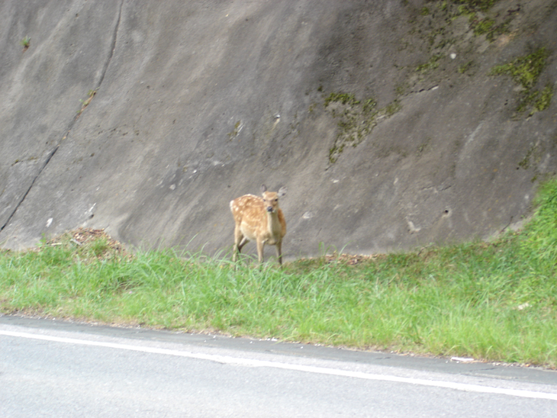 さらに道を走っているとだんだん山道になってきた。 前方になにかいる!? 近づいてみると野性の鹿だった。 こんなに近くで鹿を見るのは初めて。 襲ってこないだろうか…… 怖いので遠くから写真を撮る。