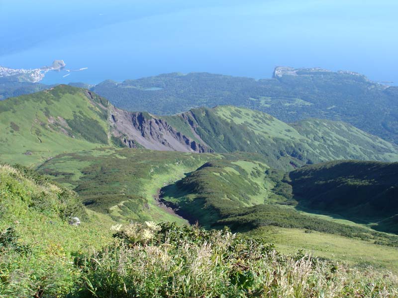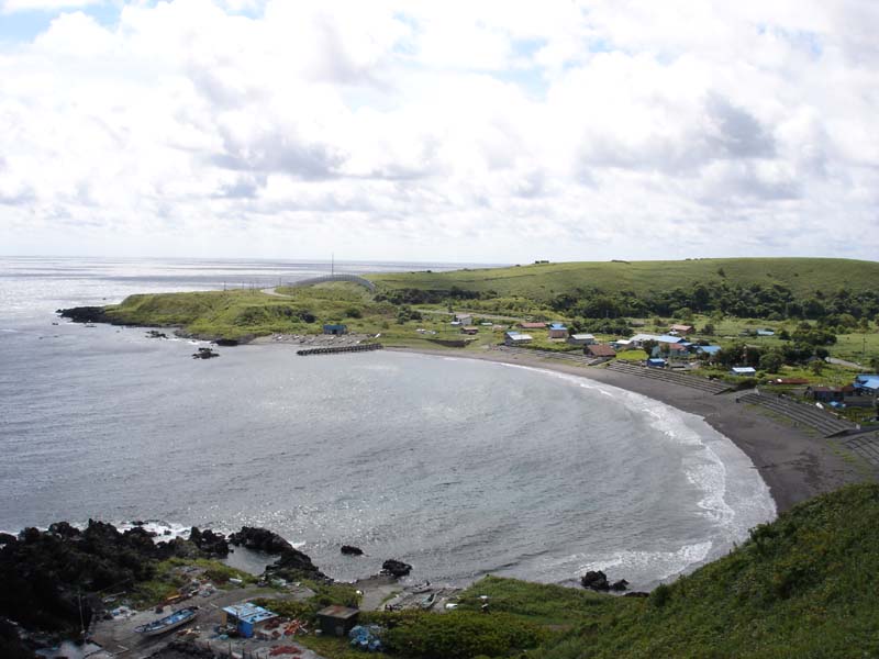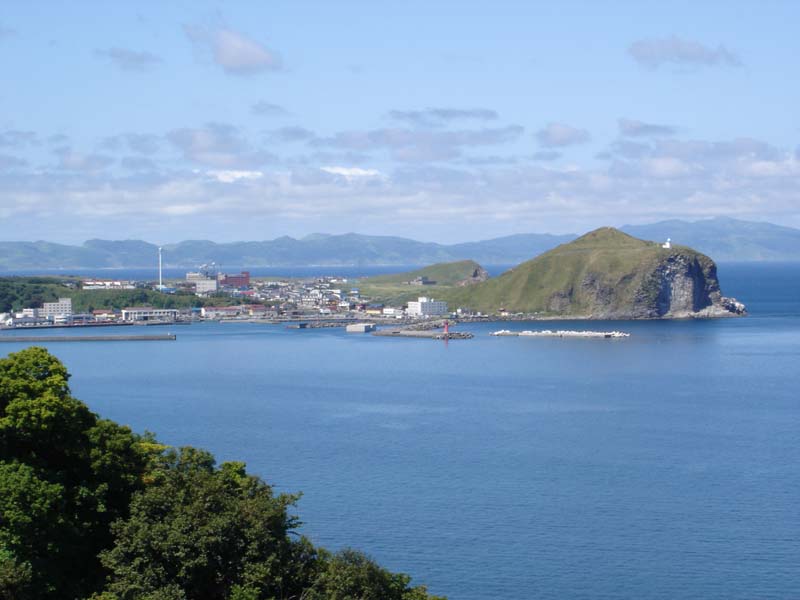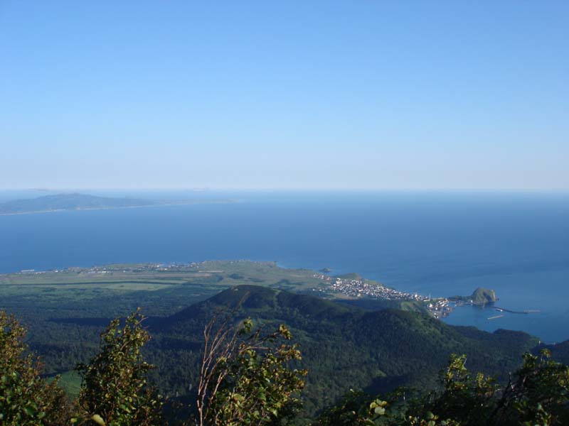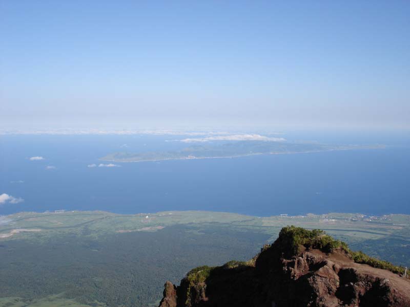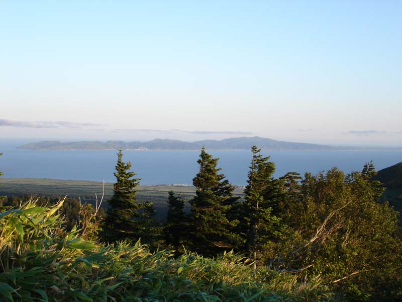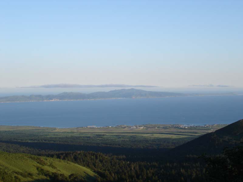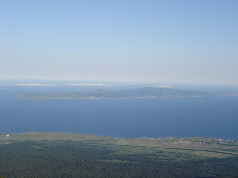 時間が余ってしまったので利尻島観光に行くことにした。 島一周が53km(看板に書いてあった)なので、いろいろ回っても3時間もあれば回れるだろう。 さっそく島内観光に出発。 まず姫沼展望台というところにいった。 ここから北海道とペシ岬を眺める。 冬のとても天気のいい日にはサハリン(ロシア連邦)も見えるらしい。 夏じゃ無理かなぁ。