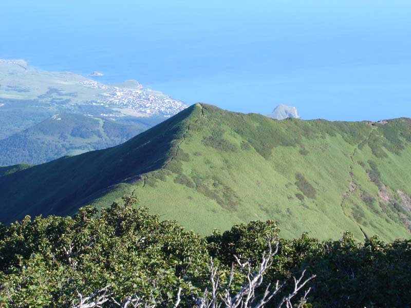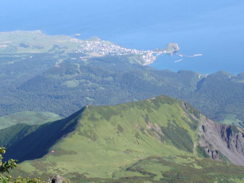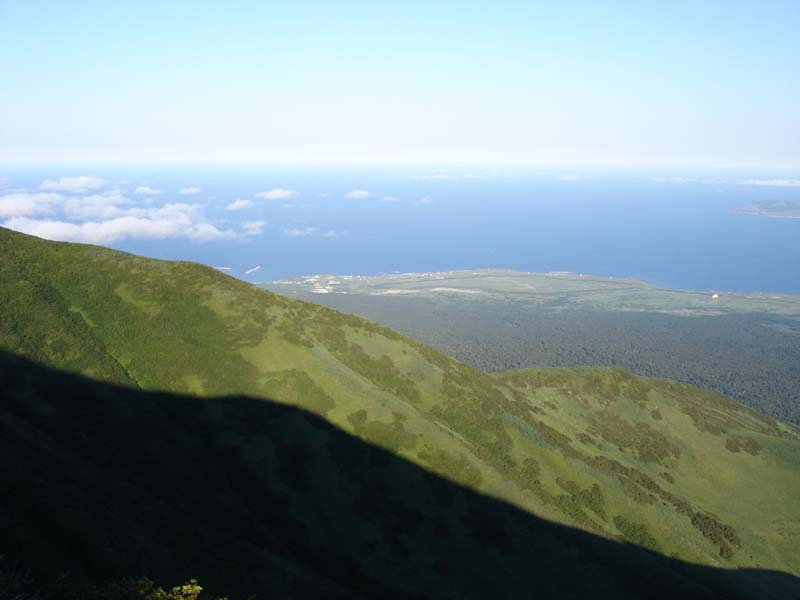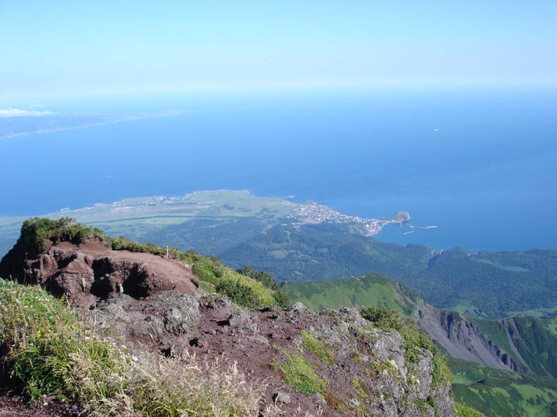 そして林道のような道をテクテク歩く。 しばらく歩き5合目に到着した。 ここから登山らしくなってくる。 大きな石が転がっている道をどんどん登る。 途中で老夫婦と女の子1人抜かした。 そして6合目到着。 かなり見晴らしがいい。 名前も「6合目:第一見晴台」と書いてあった。 鴛泊の町はけっこう小さくなって見える。 ここからも同じような道が続く。 カーブが多くて前方があまり見えないのが助かる。 しばらく歩き7合目到着。 そろそろ休もうかと思ったけれど、8合目まで行ってから休もうと考え直した。