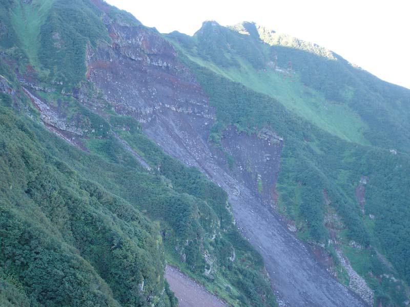 そして9合目到着。 看板に「ここからが正念場」と書いてあった。 今から一番きついところに突入する…… 9合目の平坦になったところもゆっくり歩いて呼吸を整える。 立ち止まったら歩き出すのが辛そうなので立ち止まらずゆっくりと。 そのまま9合目を通過する。 ここから山頂まで、標高差400mくらいある。 登山口が200mだったので、全体の標高差は1500m、そのうちの400mが最後に来るとは…… 9合目を通り過ぎた。 最初はあまり傾斜も変わらず、ゆっくりと呼吸が乱れないように歩いた。 だけどだんだん呼吸よりも足がきつくなってきた。 太ももが上がらなくなってくる。 時にはすごい歩幅を狭めて歩いた。 だんだん火山の石みたいなものに変わってきた。 歩くとずりずりいう。 かなり登ったところで「沓形登山口」と合流するところまでやってきた。