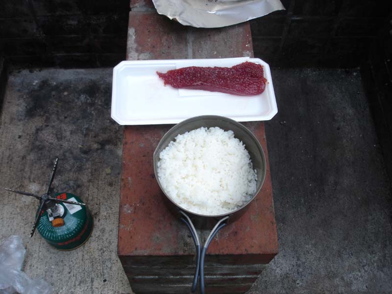 テントの中で8時くらいまで過ごす。 出かける前に朝食を……と思ったのだが食べるものが何もない。 しかたない、味噌汁だけ作るか。 お湯を沸かしインスタントの味噌汁を飲む。 さてと、出発!