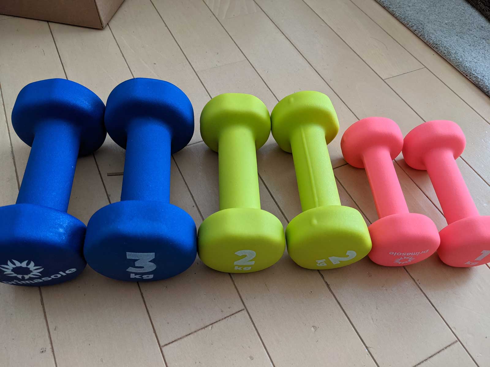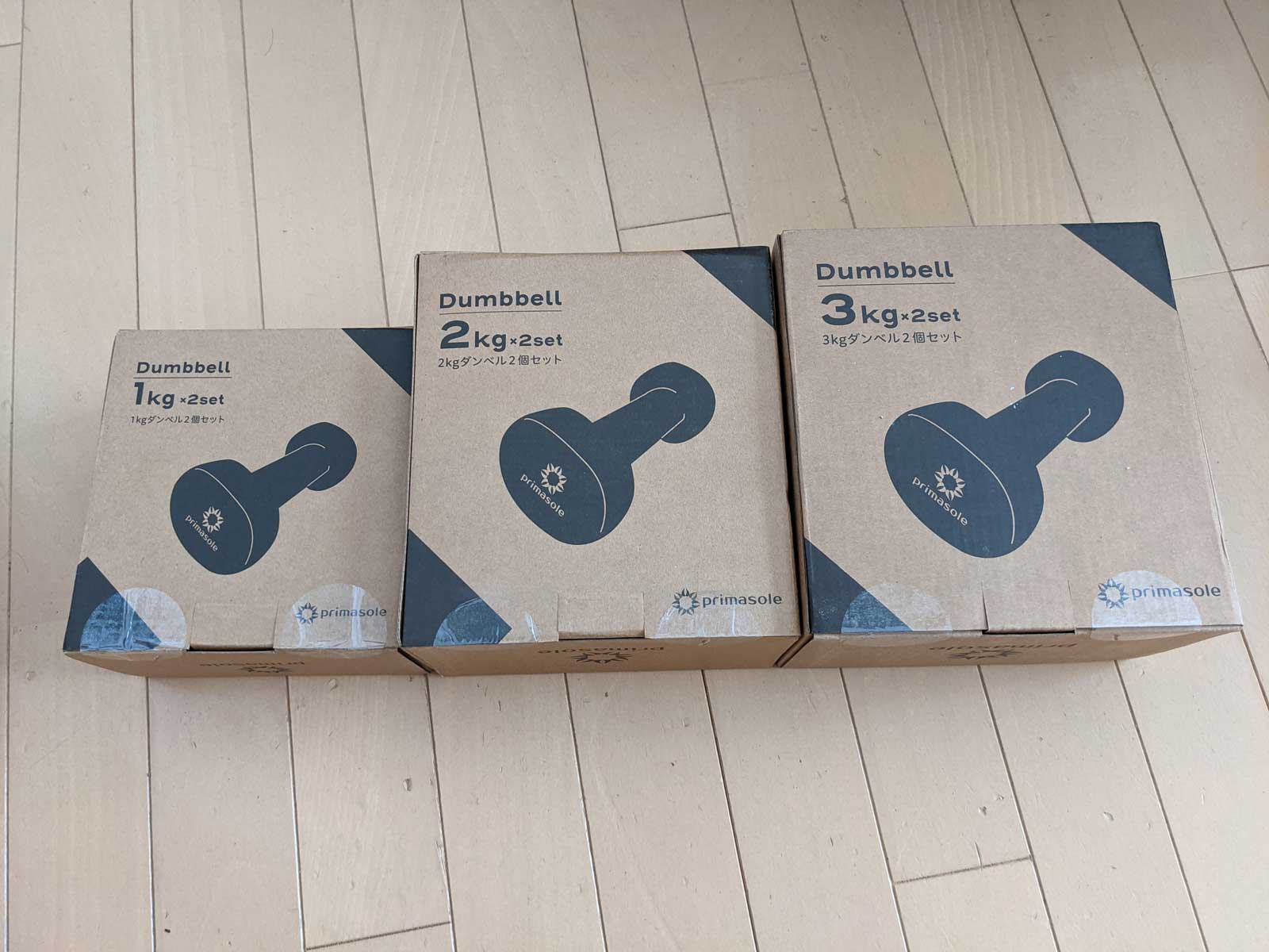 今日はAmazonで注文したダンベルが届いた。 三女の陸上クラブで、家で筋トレしないといけないので、Amazonで購入したのだ。 ダイソーとかには、水を入れるタイプのしか売っておらず、スポーツ用品店では、3kgのダンベルが2,500円くらいするので、Amazonで怪しい中国製品が並ぶなか、吟味した「プリマソーレ」というダンベルが今日届いた。