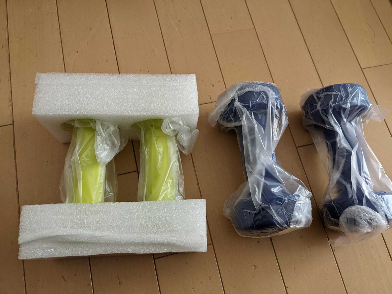結果は大正解だった。 ダンベルなので別に箱はいらないのだが、箱にきちんと梱包されていて、箱の中も丁寧に緩衝材が入っていた。 ダンベルもゴムみたいな触感で滑らず持ちやすい。 臭いが気になるというレビューもあったが、臭いは全くせず。 買って良かったなぁ。