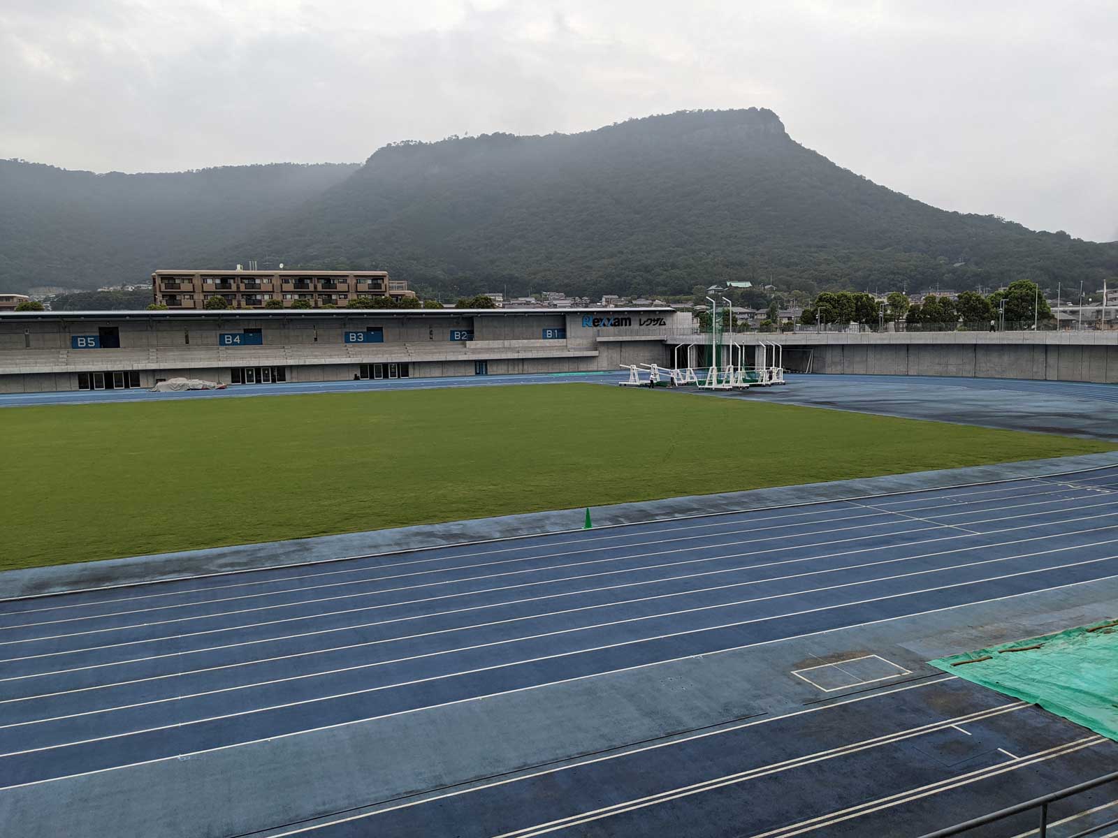 室内競技場の棒高跳びマットの裏の方に三女から借りてきた陸上用のヨガマットを敷いて荷物をそこにまとめる。 さあ、アップをしよう。 早く起きたものの、朝から体が動くわけではないので、まずは2Fコンコースを1kmくらい歩く。 それから、サブトラックをゆっくり1000mくらい走った後に、100mくらいをスピードを上げて走る。 メイン競技場に戻ってきて、トラックを1周。