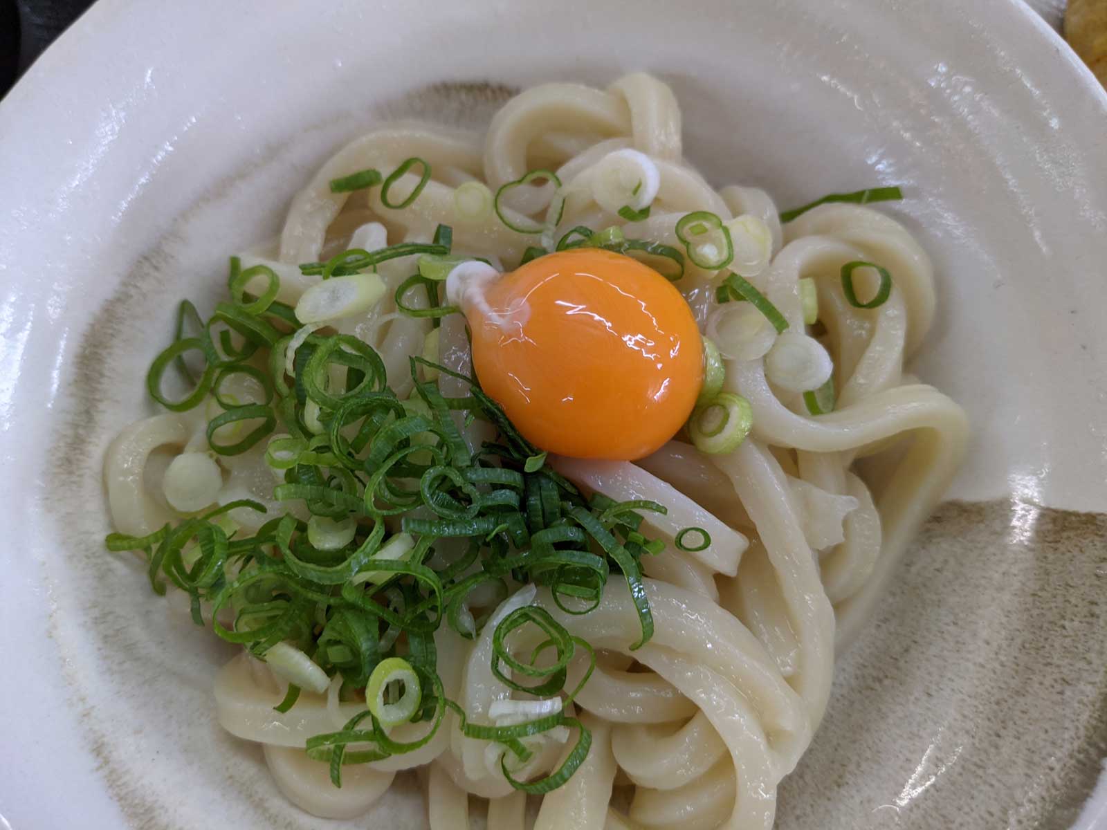 お昼ご飯は「とにかく とに麺」で釜玉うどんと、高野豆腐の天ぷら。