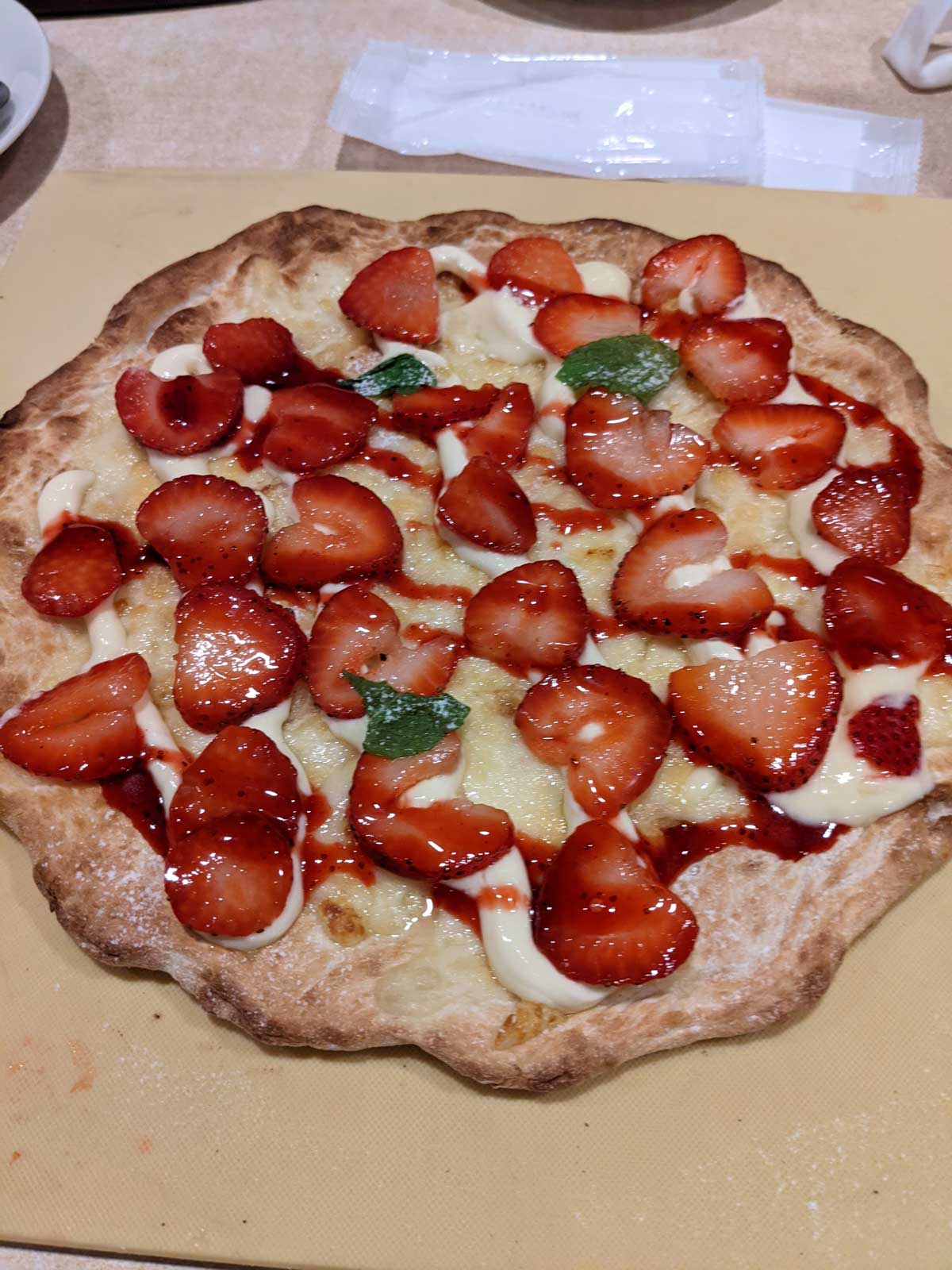 シャワーを浴びてからは、夜ご飯を食べにグラッチェへ。 いつも食べてるペペロンチーノと、みんなで食べるデザートのいちごピザを頼んでお腹いっぱい。 いちごピザは、食べるまで「不味そう」と思われていたが食べてみたら意外に美味しかったみたいで好評だった。 すかいらーくグループほどの企業になれば、メニューはかなり熟考されているだろうから、不味いものはないだろうな。
